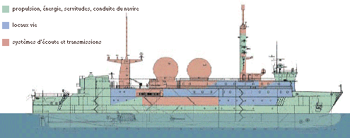 Un effectif de 80 spécialistes du renseignement peut travailler à bord. Des systèmes de stabilisation performants garantissent le bon fonctionnement des moyens d’écoute sur des mers très formées.