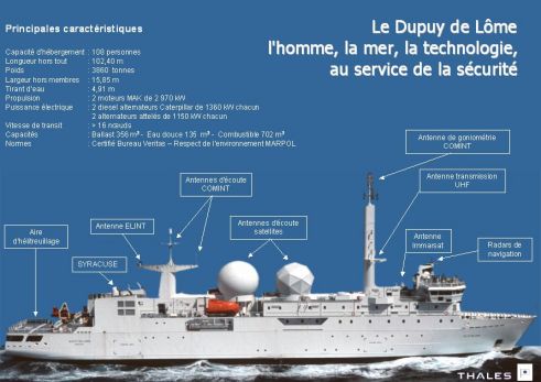 Le Dupuy de Lôme est le premier navire français conçu, dès l’origine, pour sa mission de recherche électromagnétique. Les performances nautiques du bâtiment sont directement liées aux systèmes opérationnels d’écoute. Le Dupuy de Lôme est construit dans le respect des normes civiles (bureau Veritas), conformes aux règlements de la marine marchande qui incluent le respect de l’environnement. Il répond à des exigences strictes en termes de réduction des coûts. Le contrat de soutien, d’une durée de 5 ans, vise à assurer la disponibilité du bâtiment et de ses systèmes 350 jours par an, en garantissant le fonctionnement des fonctions clés du navire.