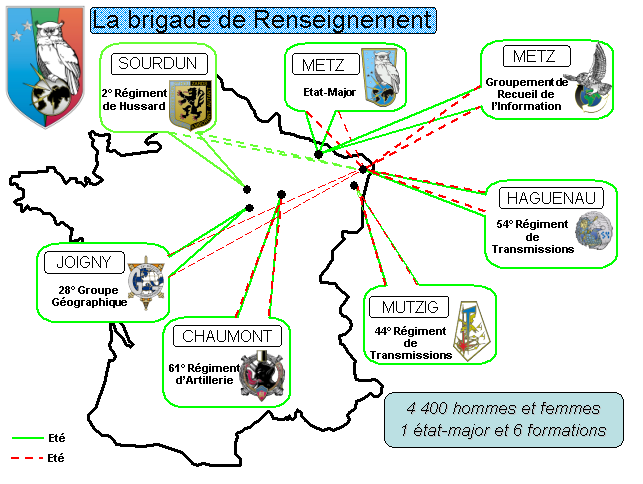 Créée le 1er septembre 1993, la Brigade de renseignement (BR) est une brigade d’appui des forces terrestres, spécialisée dans la recherche du renseignement militaire et d’intérêt militaire et dans la géographie militaire, permettant la prise de décision d’engagement des forces puis la conduite de la manœuvre des divers détachements spécialisés sur un théâtre d’opérations donné.